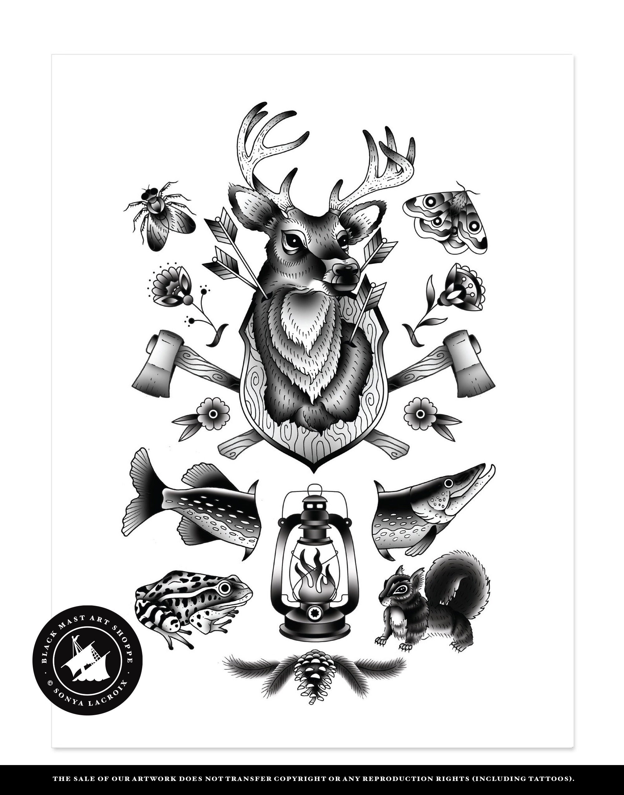 Outdoors Flash Set Deer Animals Traditional Tattoo Flash Etsy Uk